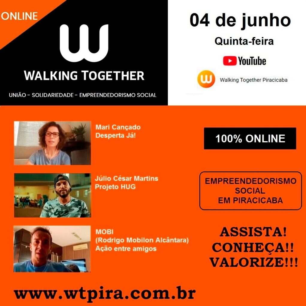 O Primeiro Walking Together Piracicaba Online com a participação especial da Mari Cançado com o Projeto Desperta Já, o Júlio com o Projeto HUG e o Moby com as Ações Sociais entre Amigos.